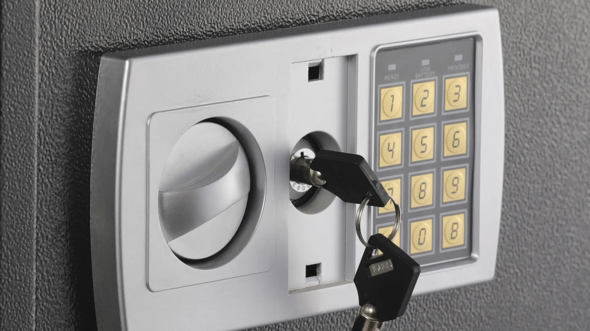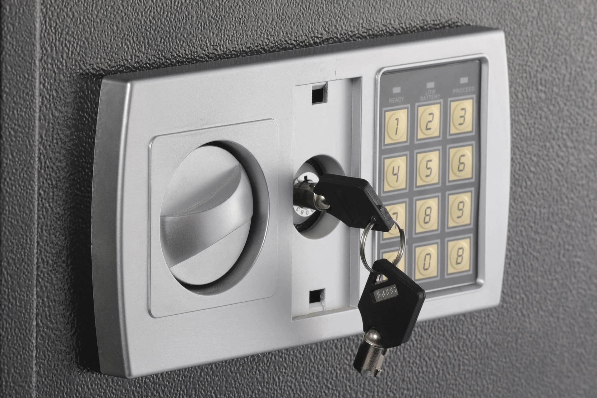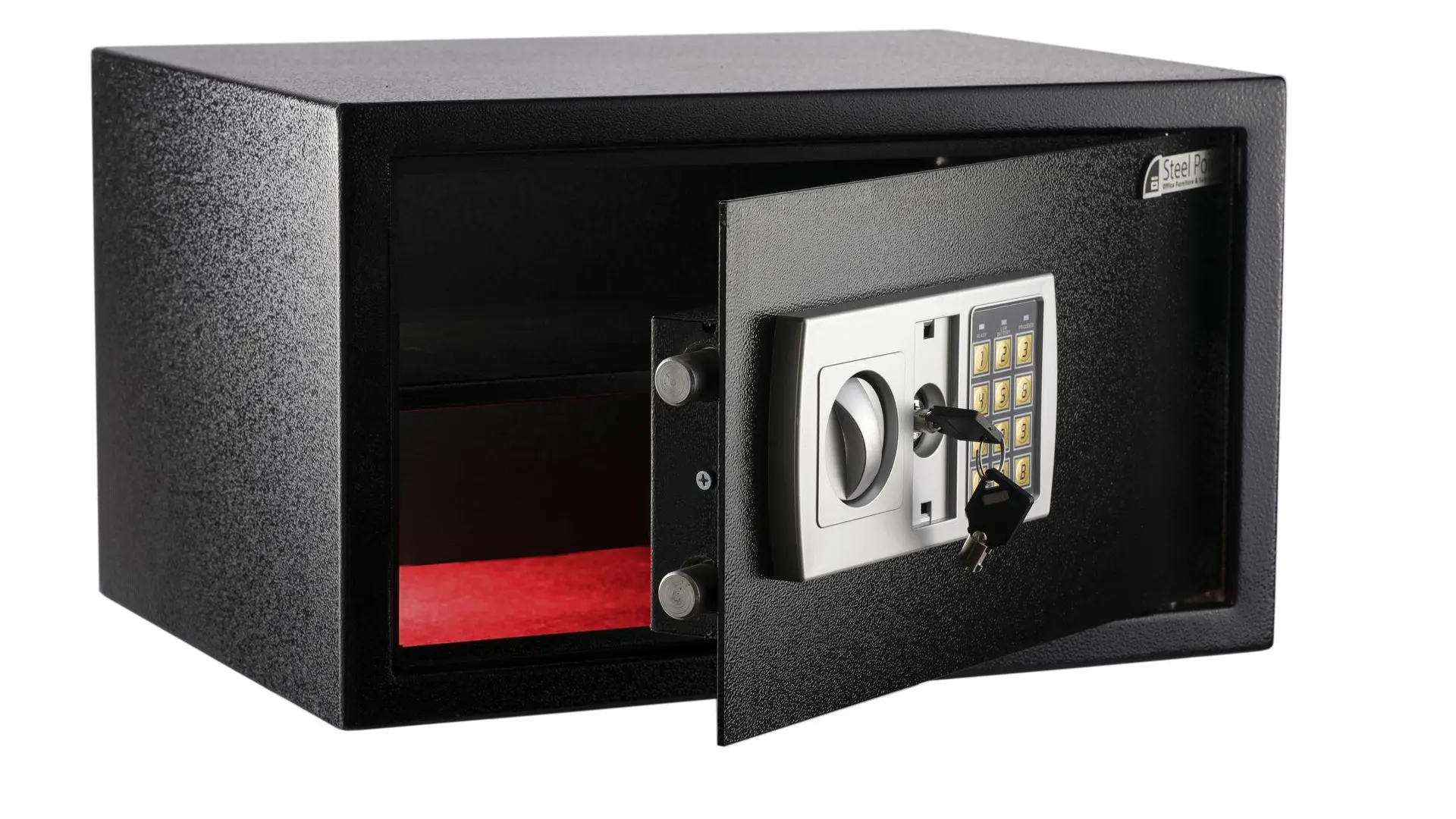 - 1-cubic-foot security safe with electronic lock and 2 emergency override keys